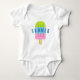 Anpassningsbar baby-hoppdräkt för nyfödd flicka eller pojke. Roligt till nyfödd bebis och föräldrar. Söta barns kläddesign för födsel av barn eller första födelsedagen party. Barn skriver ut för underbar dotter, kusin, barnbarn, barndotter, barnson, son, syskonbarn osv. Bodykostym i många färg som rosa, blått, grönt etc. Flickkläder som kan vara personlig. Trendigets babyduschpresentidéer. Skapa en egen biet kostym. Fruktig för barn av glasspopsikelvektor. Konstruktion av iskräm för spädbarn. Lägg till din egen namn.