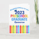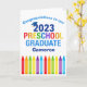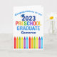 2023 års lysande förskolekort i studenten har en coola som är högre än färgstark skrivning och en rad kritor i regnbåge. Kortet Cute Preschooler student grattis i roligt färg för grundskolans sista dag med personligen barn i blått. Grattisar till vår PreK-grad!