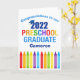 2022 års lysande förskolekort i studenten har en coola som är högre än färgstark skrivning och en rad kritor i regnbåge. Kortet Cute Preschooler student grattis i roligt färg för grundskolans sista dag med personligen barn i blått. Grattisar till vår PreK-grad!