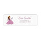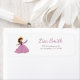 Adressetikett för återvändande med en illustration av en flicka i en rosa klänning med krona och en fjäril i handen. Underbar för flickpapper. Anpassa texten med din information och klicka på Anpassa ytterligare för att göra ändringar i typsnitt och storlekar. Illustration av Patricia Alvarez.