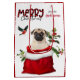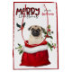Bilden på både fram- och baksidan av denna julklapp är en bild av en söt Pug-Hund som pendlar ut från en presentsäck i Helgdag. Bakom honom ligger en sprit av grå och röda bär. En röd och svart bullfinkfågel kommer snart att landa. God jul". Din egen namnteckning finns i två fält för att du ska kunna anpassa dig. Se till att se matchande produkter, inklusive prydnadsföremål, i vår butik.