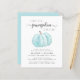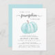 En söt, budgetvänlig partympduschinbjudan till babypojken med "En söt liten Pumpkin är på väg" i enkel grå typografi och ett elegant skript, och en pastellblå pumpfärgad vattenfärg.