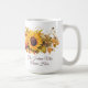 Om man dricker pumpakryddat smakar man så mycket bättre av en personlig faller mugg. Den här gamla Thanksgivingen pumpa teckning har med söta vintage orange pumpor, höst löv och söta höstsolrosor. Nostalgic Happy thanksgiving mugg med brunt skript i ditt namn