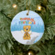 Cute Puppy med ben på en snöledsdekoration. Perfekt för hundälskare. Barnen kommer att kärlek denna beundransvärda och färgstarka julprydnad. Lägg till ett meddelande i bakgrunden.