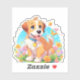 Ett klistermärke med bild av en söt marionett sitta bland blommorna. Han ser mycket lycklig ut att vara omgiven av blommor och fjärilar.perfekten till ge de som puppen hundar i kärlek. Innehåller generativ innehåll.