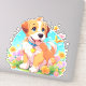 Ett klistermärke med bild av en söt marionett sitta bland blommorna. Han ser mycket lycklig ut att vara omgiven av blommor och fjärilar.perfekten till ge de som puppen hundar i kärlek. Innehåller generativ innehåll.