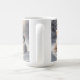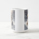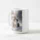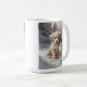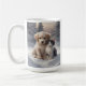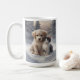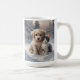 Kaffe mugg med en välvillig marionett och kattunge som klär sig i snö.