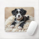 En liten, svart och vit valp ljuger bekvämt på en plush, filt och kudde med grädda färgader