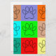 En söt mönster av svart hund i tass avtryck på torg av olika färg. Ursprunglig dekorativ design.