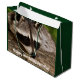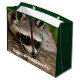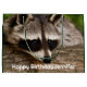 En presentpåse med ett foto av en söt och nyfiken tvättbjörn som vilar ansikte på en trälogg. Det är bra.