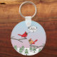 En illustration av ett sött rödkardinalparet lycklig på ett litet gren, som sjunger "God jul" i snöberget, omgivet av gräs träd täckt med snö. Den här sångfågeln hälsar kärlek med sin söta musik. Låt oss inspireras av julen och den med din familj och dina vänner.
