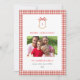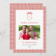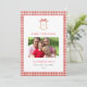 Fånga säsongens själ med det här charmerande återjulhälsningskortet med sött rött och vit gingham plaid gräns. En vackert handmålad vattenfärgad monogrammad vapensköld med båge tillför personligens elegans. Anpassa den med familjens ursprungliga och omhuldade foto för en söt och diskettenhet som återspeglar deras sydliga charm.