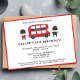 Cute London Theter Födelsedagsfest inbjudan med ett rött dubbla-decker buss, palatsskydd och polisman. Bakåt har en röd bakgrund och anpassadet är text och gammal.