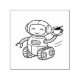 Svart och vit tecknad illustration av en söt futuristiska-robot som rullar snabbt medan man håller en kopp kaffe.