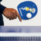 Cute-robot som flyger i illustration av rymdens te pingisracket
