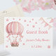 Fint bunny som flyger i en ballong omgiven av stjärnor. Illustration i skuggor av rosa på vit bakgrund. Gäst Bok för önskemål för baby perfekt för en barndusch om du väntar dig en tjej. På baksidan illustreras rosa stjärnor och presenter.