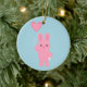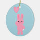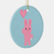 En söt, rosa, kawaii stil bunny, med ett knubbig ansikte, arm och ben, håller en hjärtformade rosa ballong på en ljusblå prickerbakgrund.