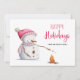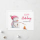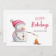 Ett kort för rosa helgdag med en illustration av en snögubbe som bär rosa hatt och halsduk. Snögubbe rostar marshmallow av elden. Illustrerad och designad av Patricia Alvarez.