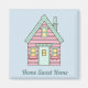 Söt illustration av ett rosa-hus på blå bakgrund med texten "Home Sweet Home"