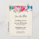 Bröllop spara datum-vykort med botaniskt gräns som innehåller rosa ros och ponnyer och blå pansier. Bakgrund är en faux-parchment-bild. Färgstark och ljusstark. Skitsam och summerös.