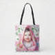 I stället för en presentpåse som bara kommer att kastas bort, packar du alla dina babyduschar eller nyfödd bebis-gåvor i den här söta återanvändbara väskan! Baby med svart hår och blått ögon ler under en rosa rosenknopp till och från gåva till väska. En bakgrund med rosa ros och grönt foliage.