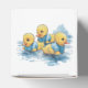 Vattenfärgat gummi anka i gult i blå kläder i en vatten-puddle. Underbar för baby-daghemmet!