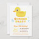 Inbjudan gäster över för en coola sommarfödelsedag med den här söta och öga som fångar gult gummi ducky bassäng flyter. Texten "sommar party" i runda och bubbla som typsnitt går inte att redigera. På motsatt sida är den vita silhuettkonturen av ankan som upprepas i mönster över en ljusblå bakgrund. Anpassa enkelt dina party-detaljer i det utrymme som finns.