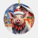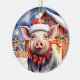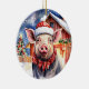 Kute julen i gris fick personlig som prydnadsämne med en vattenfärgad stil-hake framför en lada på en snövinter.