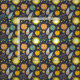 Cute, tecknad utan rymden på marin blå bakgrund. Utformningen omfattar texten "Rymden" och "Cosmos". Planeter, måne, sol, stjärnor och galaxer ingår också.