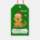 Den här söta tecknadens bruna marionettens öga göms av hans shaggiga päls jackar, men han varnar med ett Woof! att mottagaren ska vänta till jul för att få en titt på den här presenten! Puppen bär en traditionell röd och vit julhatt. Bilden och texten placeras på en grönt i helgdag. Både framsidan och baksidan har valvbilden, men varje text fält kan anpassas separat.