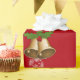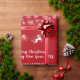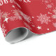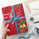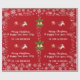 Modern, elegant och söt julomslutning papper, med en bild av en enhörnig som drar tomtens själ (fullt av gåvor), texten "God jul & Gott nytt år 20XX" i snyggtens manus/kalligrafhandskrift och en personlig namn. Med sprinkler av vitt och silver snöflingor, och ett par av Julafton klockor med en spiral av holly, på Julafton röd bakgrund. Se till att du anpassar namn och året.
