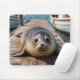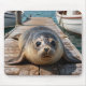 An adorable mouse pad featuring a cute seal sitting on a boat dock by the ocean just look sweet as can be.