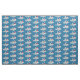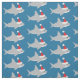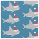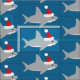 Fabric med en mönster av söt, leende, hajar i Santa Hats på blå bakgrund.