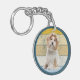 Den här nyckelkedjan har en porträtt av en ynklig liten brun och vit Shih Tzu-hund. Bilden placeras på en baksida, något tryckt än, guld och blå baksida i stil. Baksidan har en helblå bakgrund med texten i två fält.