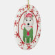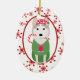 På framsidan av den här Helgdag är en söt hund i Siberian husky med en röd och vit polka punkt Santa Hat, en grönt svettare och en röd klocka. Han bär en strimlad candy cane i munnen. Bilden placeras på en vit oval som ramas in av en retroröd snöflinga mönster. Baksidan av dekoratet har samma bakgrund och ovaler med anpassningsbarna i två fält. Cute! *Tack vare Gift Season Shop för hund i den här designen.