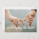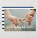 Nautisk spara datumkortet med ditt utfallskort vågrät bild och ett textöverlägg med ord, "vi gifter sig" i ett vitt handskriftsteckensnitt. Nedan visas dina detaljer på en enda textrad. Baksidan har marin blå och vit rand och en textrad för ytterligare information. En enkel och modern design som gör fotot till huvudfunktionen.