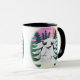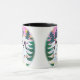 En roligt Ringer Mugg med ett svart läppar och handtag och två söta Penguins med roligt, skridskor, i ett snölandskap med rå träd och ett sol, från ett handmålat pappert kollage av Judy Adamson.
