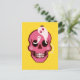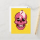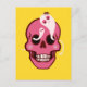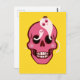 Skådekort med en tecknad som illustrerar ett lustigt rosa skalle med rosyskben och två söta spöken i öga socketerna som tittar på varandra och ler, en liten ljuvlig spindel som står ovanpå en av dessa skämtvänner. Den här roligten är makaber och har en klar psykedelisk, trippig rosa och gult färger.