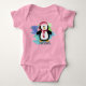 Det här är en söt vinterdesign för baby eller småbarn! Den har en bild av en fin penguin som är klädd i en rosa- och maronsjal och julhatt och som rider på en sled. Bakom penguin-bilden finns en färglös stänk-design i abstrakt i blått, akvatiskt och kalkgrönt. Ljus och roligt!
