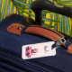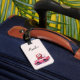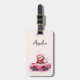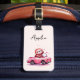 A luggage tag with an adorable illustration. A happy looking sloth sitting in a sporty pink convertible. Waving as he drives by. With hearts floating upwards.