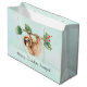 Gåsväska med en vidsträckt lutning uppifrån och ned från träd gren. Träd gren är dekorerat med tropiska löv och bär. Ange på en ljust grönt bakgrund.