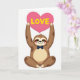 Designed with a cute sloth sitting in the center, this card keeps the focus on a simple message of love. The sloth is warm brown with a light beige belly and darker patches on its arms and legs. It sits cross-legged and lifts both arms to hold up a large pink heart above its head 💘. Inside the heart, the word “LOVE” appears in sunny yellow letters that look thick and easy to read, placed right in the middle. The sloth looks happy, with a wide open smile, rosy cheeks, and dark eyes framed by its usual face markings 😘. A dark blue bow tie at its neck adds a sweet, dressed-up touch. The background is plain white, so the sloth and heart stand out clearly and feel calm and friendly.
