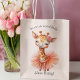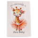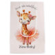 Cute, whimsical, and smiling baby giraffe is wearing an orange ballerina tutu because she's so excited to celebrate the new baby! She wears a matching flower on top of her head. Light peach-orange with orange highlights background. Customizable text templates provided.