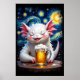 A cute, white axolotl character with pink ears and red spots smiles happily while holding a frothy mug of beer, set against a starry night sky. Clear details and vibrant colors enhance visual appeal.
