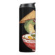 En charmerande grönt orm med en traditionell konisk hatt som glatt lösgör nudlar med käppsticks. Dess stora, uttryckliga ögon och nöjda leende bidrar till dess visuella dragningskraft. Den detaljerade skålen med nyanser, kompletta med ägg och sjögräs, belyser denna unika och vackra kulinariska illustration mot en svart bakgrund.