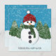 Glatta och toppen söta snögubbe med en röd beanie och en grönt sjal framför ett skogen i gräs träd medan det snöar. Denna illustration inspirerades av de många snögubbar som familjerna gör när de besöker Los Angeles-Vapensköldens bergsområde under de få dagar som är kall nog för snö i de nämnda sydkaliforska bergen. Anpassa och anpassa God jul och Gott nytt år i framkanten, samt meddelande, mottagare och avsändare namn på baksidan av kortet.
