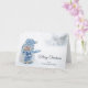 Julkort med ett sött foto med lite snögubbe. Stå utanför vintern med snö som ramlar runt. Den här söta lilla killen är klädd i blå stickade kläder. En vit/grått-bågflagga i bakgrunden.