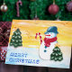 Cute Snögubbe och Julgran Helgdag Card. Ett snögubbe med Julgranar. Landskapet med stjärnor, snö och gult himlar. Anpassa texten inuti eller radera den.