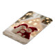 Two cheerful snow parents and their cute little snow child, all wearing matching red winter hats and scarves, soft bokeh lights and a glowing winter home in the background create a cozy, magical Christmas atmosphere.