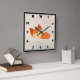 Kvadratklocka med gräddbakgrunden med trendigets mörka geometriska former. Överst är en tecknad teckning av en söt orange som sover fredligt. En grönt lämnar andedräkt bakom.